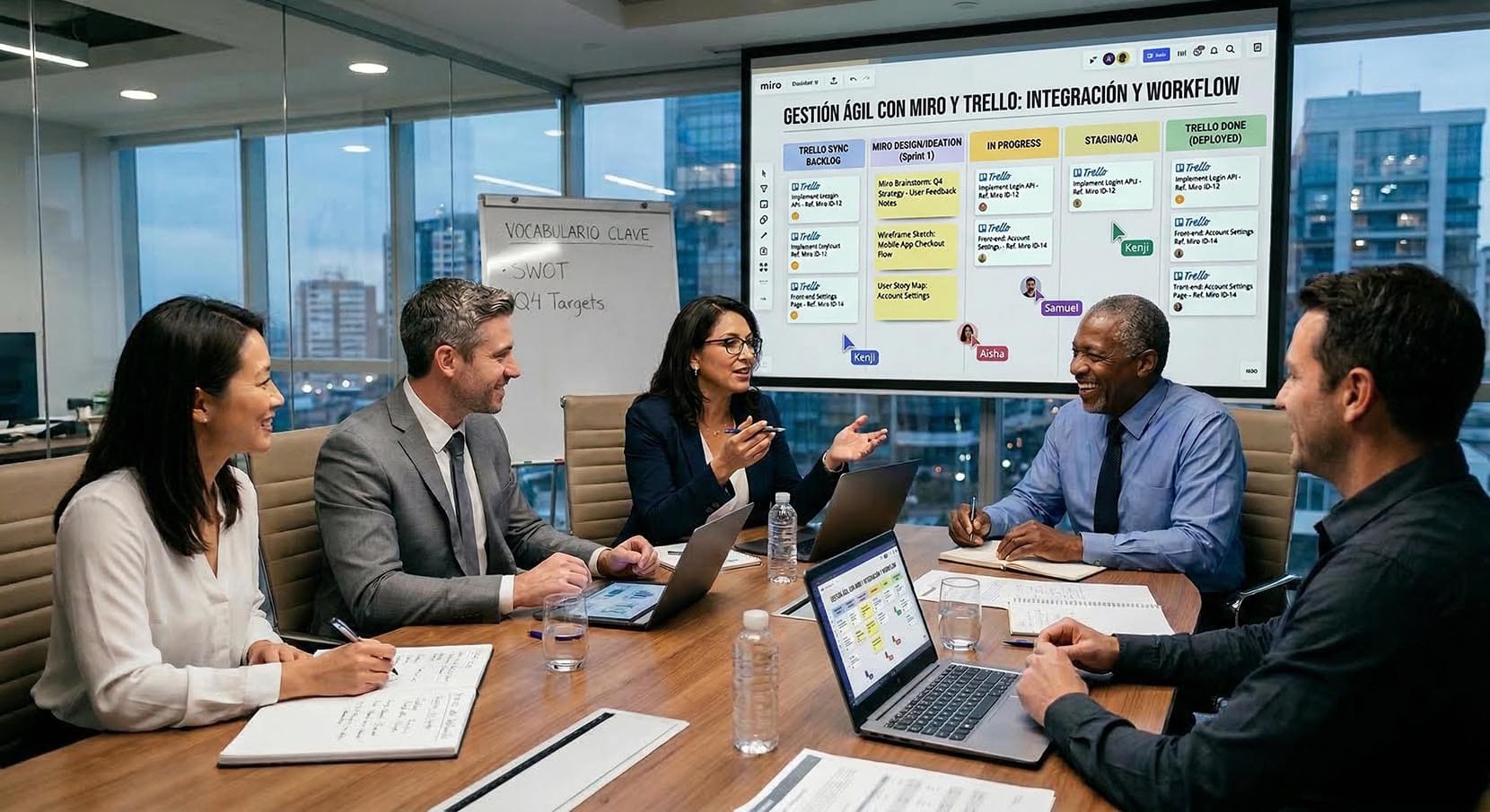 Organización de flujos de trabajo, integración de equipos y aplicación de métodos ágiles básicos como Kanban y lluvia de ideas.